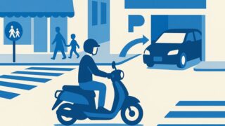 商業地は出入口と歩行者が多く、原付は見落とされやすい交通主体です。法定速度30km/hの遵守、横断歩道手前の減速と一時停止、状況に応じた二段階右折、車道の左側走行が基礎です。加えて、店舗駐車場の右折車や歩行者へ余裕を持った間合いを確保するこ...
