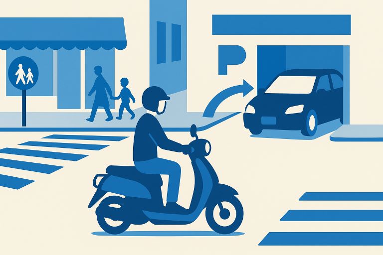 商業地は出入口と歩行者が多く、原付は見落とされやすい交通主体です。