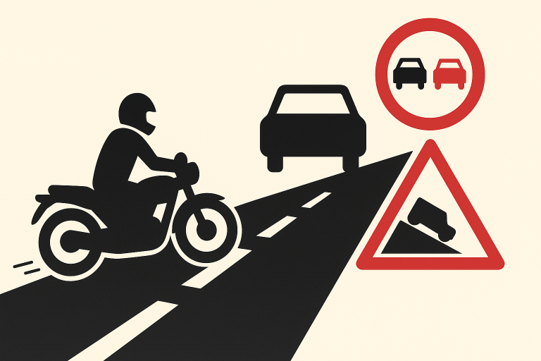 坂の頂上付近や急な下りは、視界の途切れと荷重移動で制動距離が伸びる高リスク区間。125cc超の自動二輪は速度域と慣性が大きく、無理な追越しや急制動の誤りが重大事故に直結するので、法では「追越し禁止」「徐行」「車間距離保持」「急ブレーキ禁止」「安全運転義務」を規定しています。